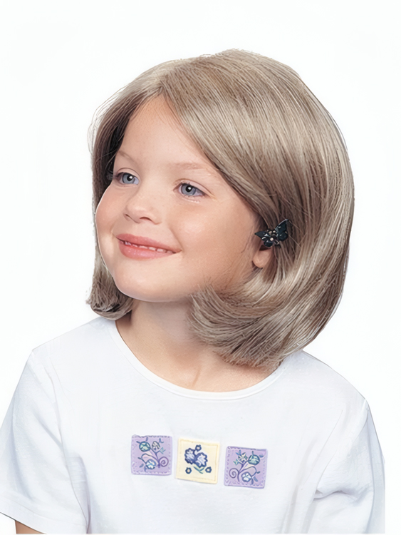 Children's Wig: short bob style with full lace cap construction for styling versatility. Sides can be pulled back with a cute barrette or style can be pulled pack into a cute pigtail.
