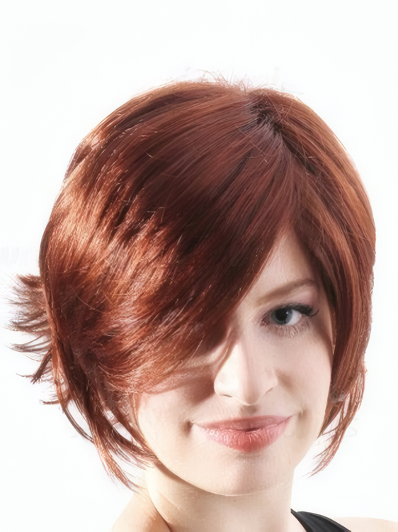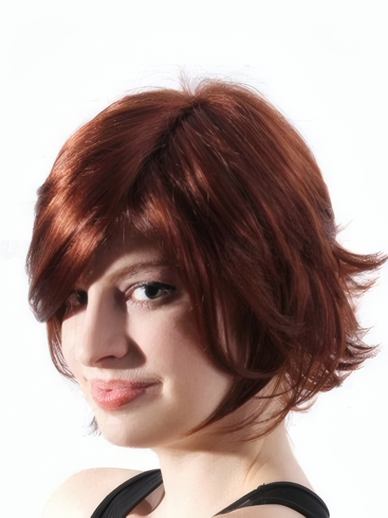 The short straight synthetic wig features textured layers, with razored ends and sexy side bangs.