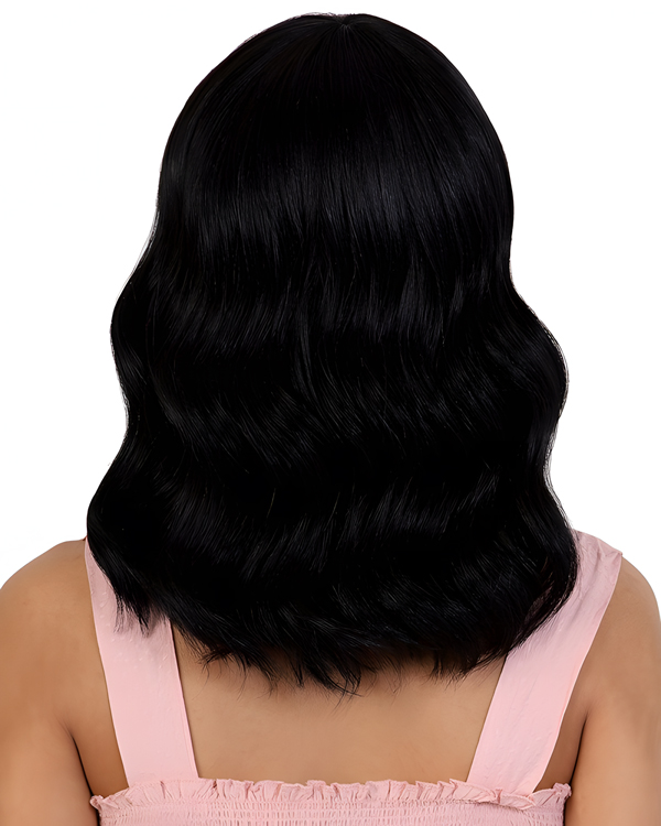Natural-Looking Black Wavy Wig with Bangs – Shoulder-Length Synthetic Hair for Women