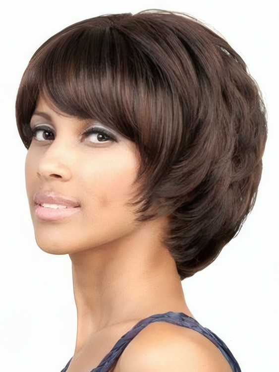 Chin length layered bob with side swept bang that features comfort elastic bands, secure fit combs and integrates the front hair line. Simple Cap Wigs fit very securely for confident wearing. Simplest way to transition into wigs by long time weave users.