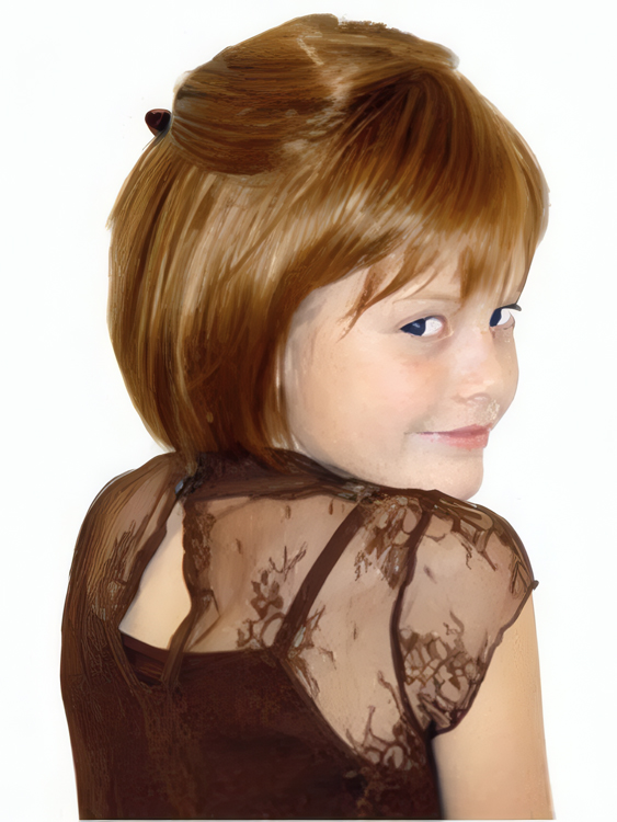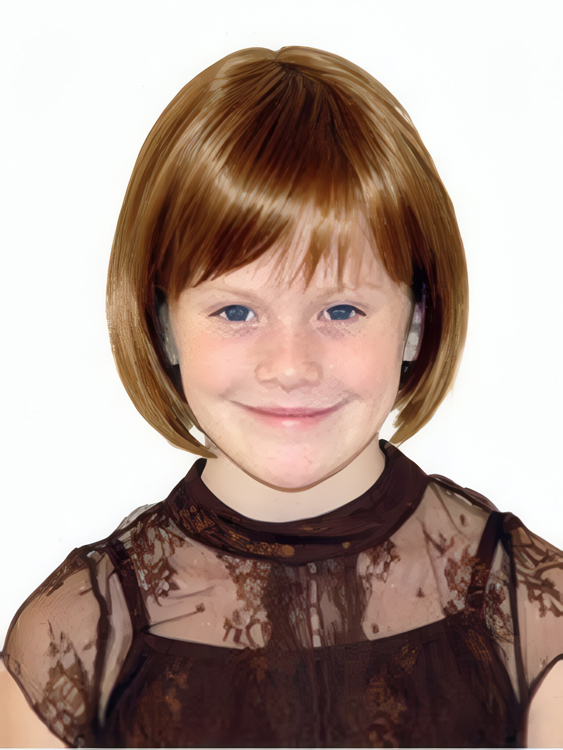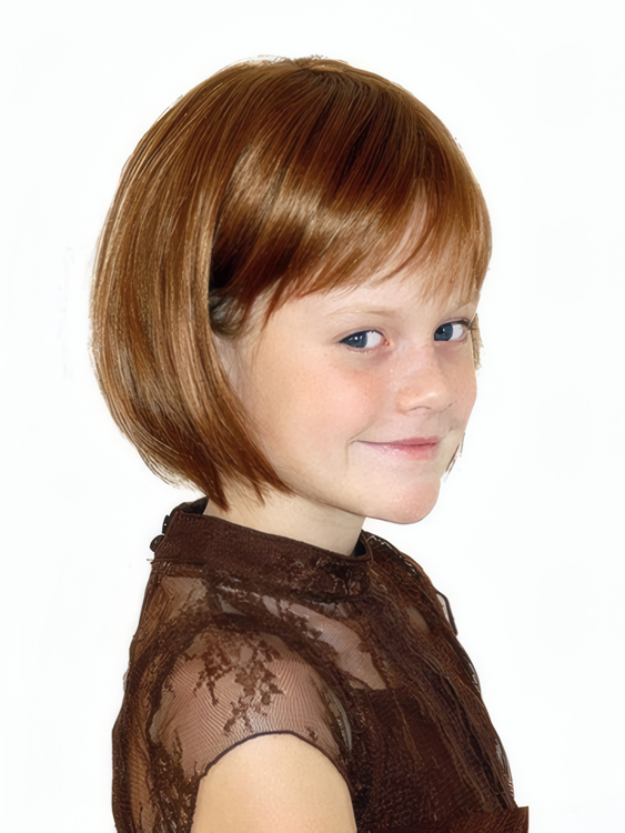 Designed exclusively for children to comfortably fit a smaller head size, the wig is a chin-length bob style with a full bangs. This wig can be styled into a variety of half-dos or customized by a salon professional to achieve a different look.