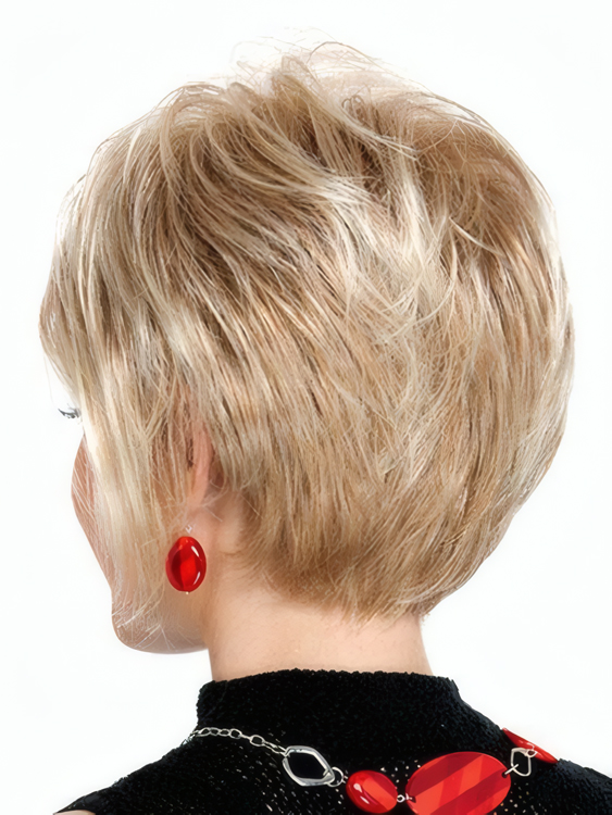 It is a modified pixie style with wispy angled sides and razor cut edges. In addition the wefted cap of the wig offers all day breathable wear.