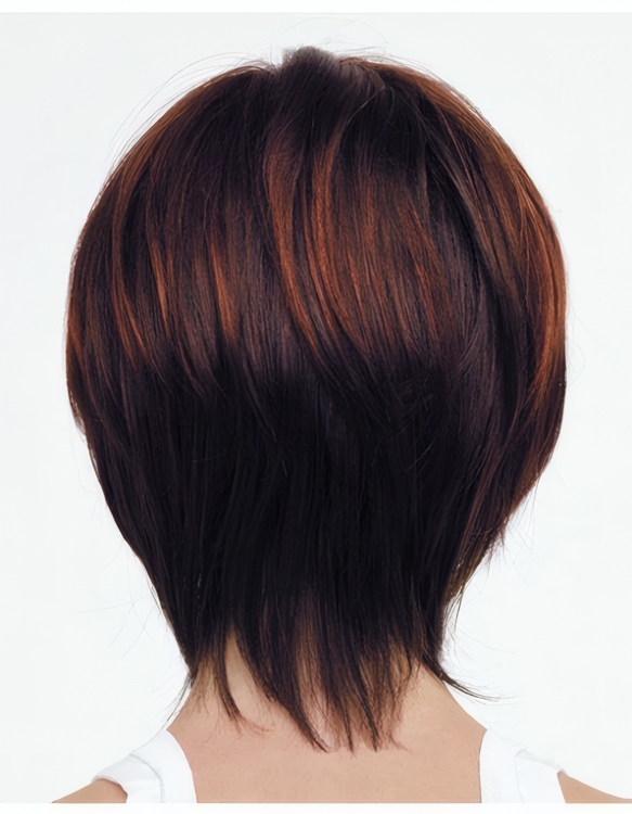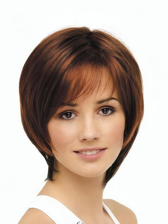 This chin length full lace light brown wig is ultra modern, features sleek straight with wispy front bangs that can be worn as a side swept bang complete with soft ends for a natural look.