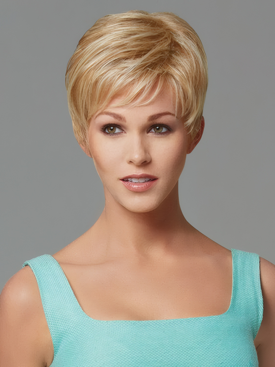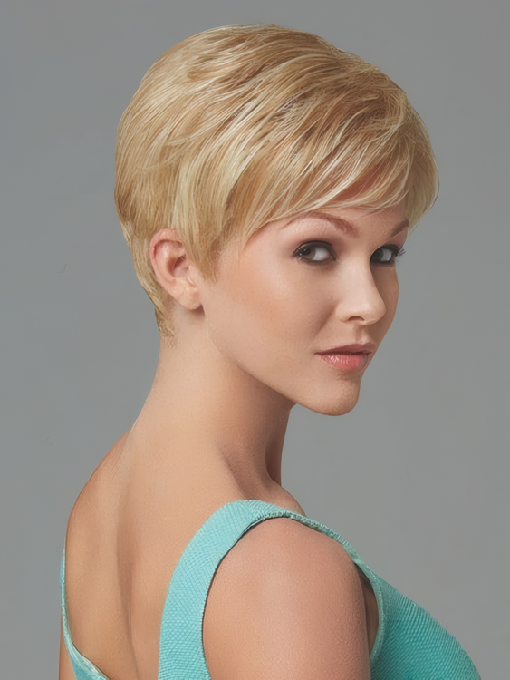 The Lovely Short Capless Synthetic Wig is a short and classic cut with smooth layers on the top and sides that blend with barely waved layers in the back.