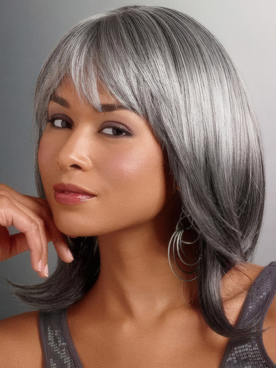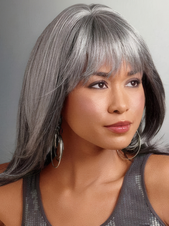 This long Heat Friendly Synthetic Wig lace front grey wig is sophisticated and so classic. A sleek curve of hair frames your face. Side part, side-swept bangs add to the feature flattery.
