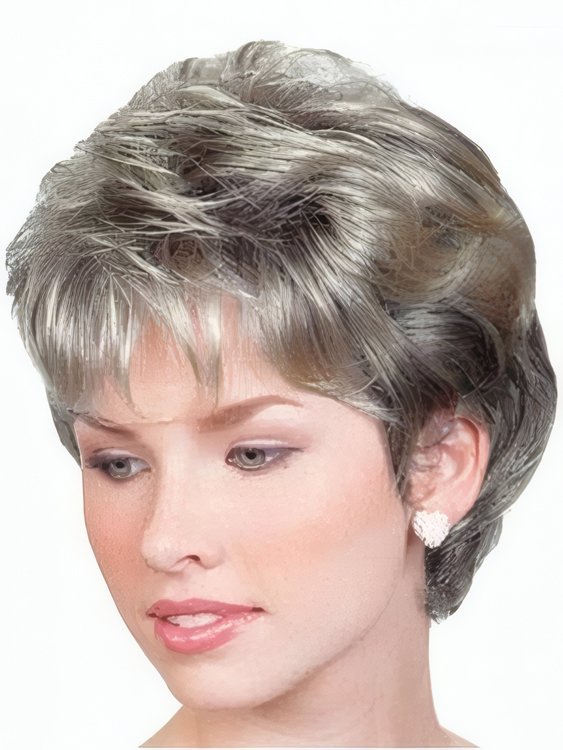 It is a short Heat Friendly Synthetic Wig with wavy hair, wispy bangs. The Wig provides the look of natural hair growth at the scalpline, along with maximum styling versatility.