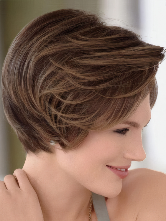 This flattering bob has lots of body and fullness and a nicely rounded silhouette. Face-flattering side-swept bangs can be brushed back from forehead for more versatility, thanks to lace-front styling.