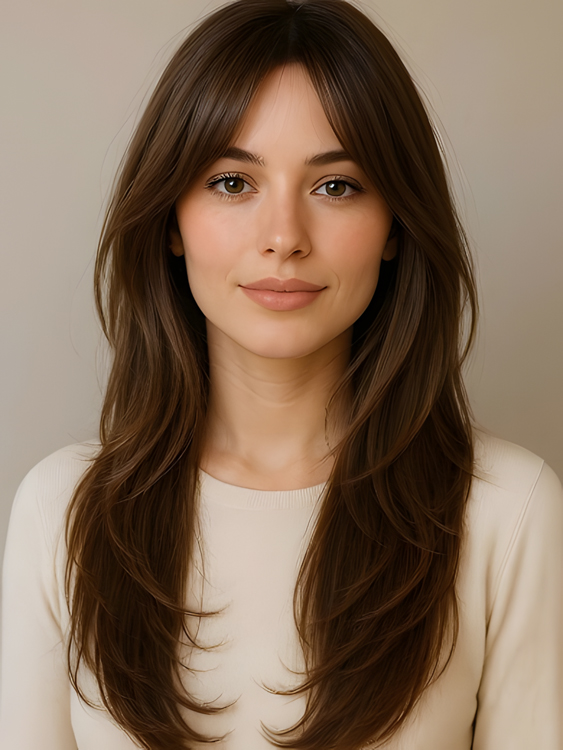 Layered Light Brown Machine Made Human Hair Wig – Natural Long Style with Curtain Bangs