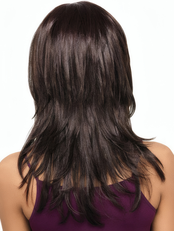 This is a long sleek layered Heat Friendly Synthetic Wig with luscious side sweeping fringe, razore all-over edges create chic and stunning looks.