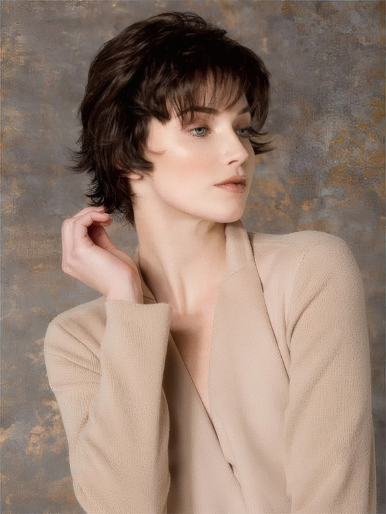 The wigs is a short, textured and layered cut with a wispy bang and flipped ends. This eye-catching, layered wig features a monofilament top with a hand-tied front,and is ideal for a petite to average head size.