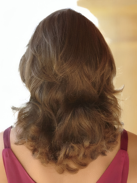 This is a long volume-rich layers wig, arranged in waves, complemented by a side swept fringe. This is a gorgeous long-length style, made from 100% remy human hair material and the capless, breathable construction makes it a great even during the summer: comfortable, lightweight and stylish.