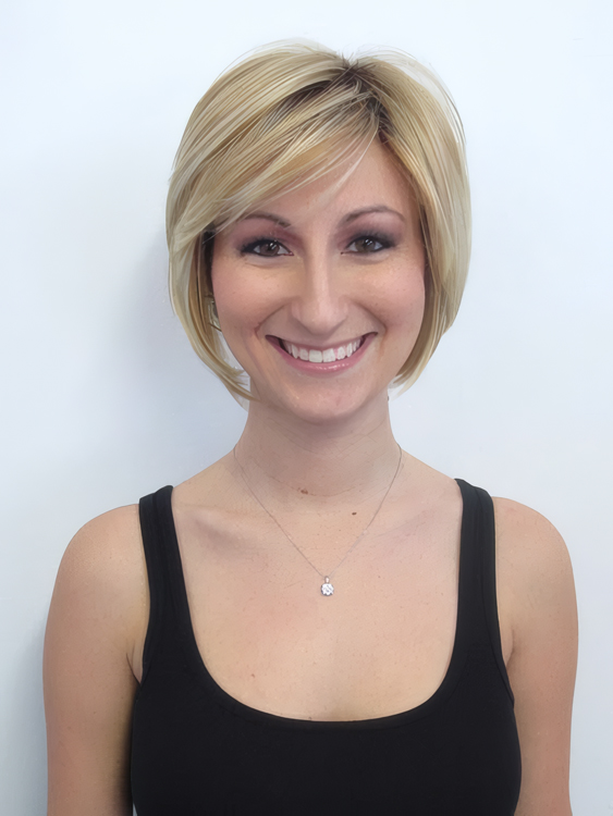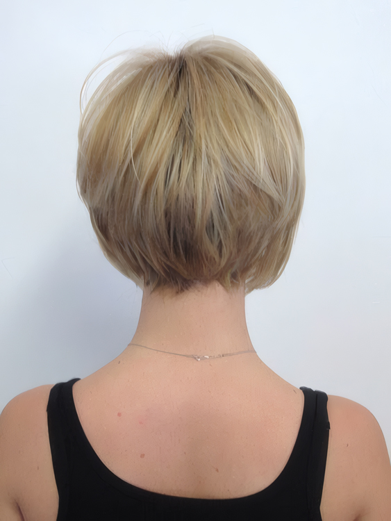 It is flirty layered bob with a tapered nape and side swept bang. The bang can always be trimmed into a regular bang if desired. It is perfect for any age she can be tamed down or teased up for great fullness!