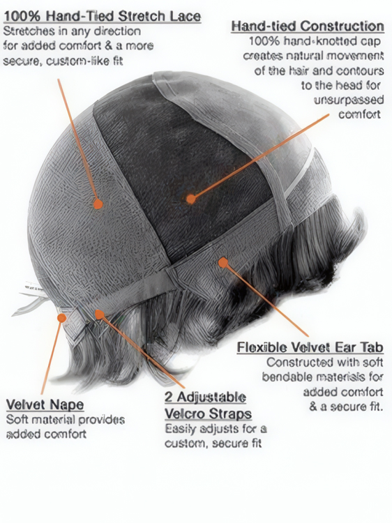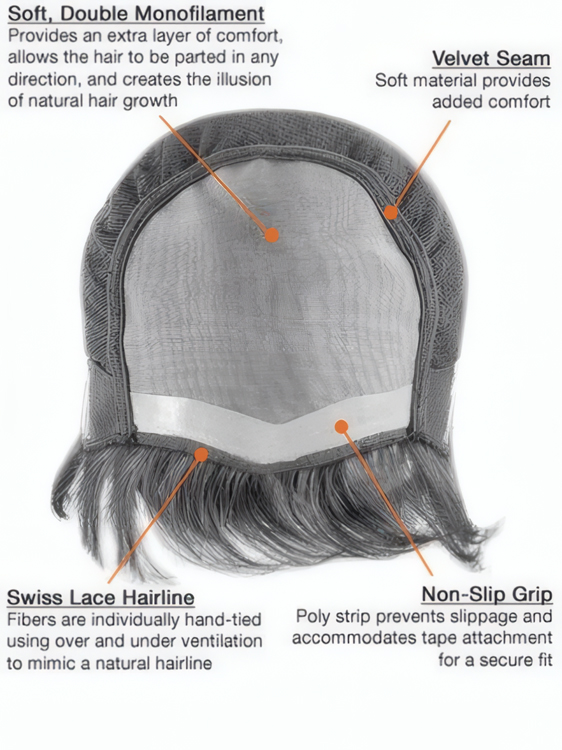 Completely hand knotted, the Fabian full wig simulates the look of a genuine, complete progression of hair. Covering the entire cranium with a light, weight mesh, netting base. The hairline has a scalloped monofilament frontage. Polyurethane patches have been placed in strategic areas to allow easy bonding. And, the rear has adjustable elastic straps on either side to accommodate most sizes.