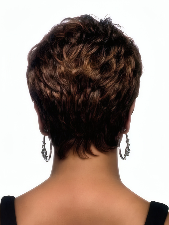 This is a short boy cut wig with layered curls, face framing bangs and a tapered nape that looks completely natural. Feathered layers and long bangs create a smart, sassy look.