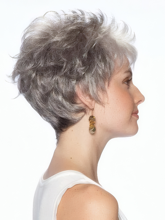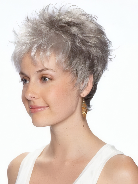 This is a short Heat Friendly Synthetic Wig lace front cut layered grey wig with retro style and edgy twist,which create plenty of volume and height in order to create a polished silhouette that'll have heads turning.