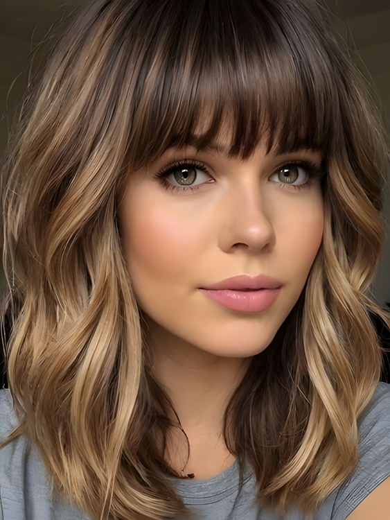 Shoulder-Length Wavy Ombre Brown Blonde Machine Made Human Hair Wig with Bangs