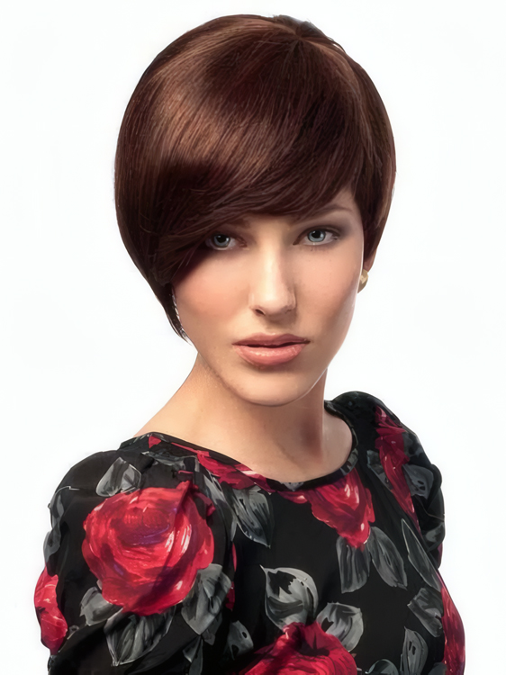 The short sleek human hair wig features stunning straight with long side sweeping fringe that frame your face beautifully. Soft layers on the end to give you a natural look and ultra-comfortable fit. Open top construction with the fine wefts and nets, making this 100% remy human hair wig lightweight, airy and easy to wear.